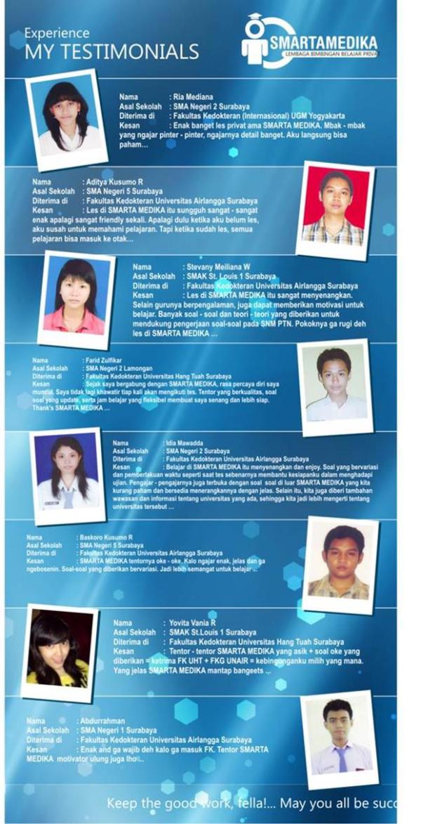 Alumni Smarta Medika Tahun 2009. Berikut adalah alumni kami yang berhasil masuk di Program Pendidikan Dokter Fakultas Kedokteran angkatan 2009.