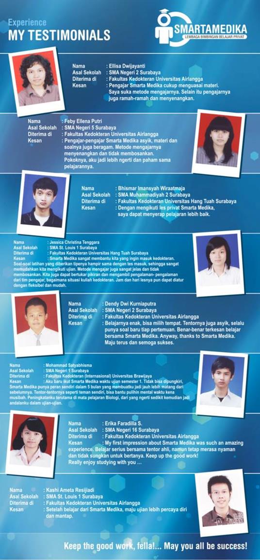 Alumni Smarta Medika Tahun 2008. Berikut adalah alumni kami yang berhasil masuk di Program Pendidikan Dokter Fakultas Kedokteran angkatan 2008.